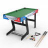 Многофункциональный игровой стол MERCURIAL 4ft — то, что нужно для большой компании! Играйте в футбол, бильярд, настольный теннис и аэрохоккей на одном столе, легко меняя игровые поля. Яркое оформление и стильный дизайн сделают игру ещё более увлекательной. Особенности стола Игровое поле Игровые поля легко менять, они изготовлены из МДФ, ламинированного ПВХ с ярким принтом игровой разметки. Сам стол компактный, не занимает много места, а игрового пространства достаточно, чтобы получить настоящее удовольствие во время игры в домашней обстановке с друзьями или семьёй. Толщина бортиков стола 30 мм, а высота - 12 мм. Размеры и оформление игрового поля Футбольное поле: 104 х 58 см, толщина 3 мм, с зелёной поверхностью и разметкой, установлены телескопические хромированные стержни 13 см в диаметре с футбольными игроками. Хоккейное поле: размер 93 х 47,5 см, толщина 4,75 см, покрытие бело-красное, с разметкой.  Теннисный стол: классическое синее поле с разметкой для сетки 96 х 50 см, толщина 4,75 мм. Бильярдное поле: стол с мягким зелёным покрытием размером 97 х 51 см, толщиной 4,75 мм; ширина лузы 6,7 см. Ножки стола Конструкция стола устойчива, что актуально для азартных и эмоциональных игроков, особенно при игре в футбол. Прочность и устойчивость ему придают ножки шириной 80 мм и толщиной 13 мм из МДФ с ПВХ покрытием и перекладины толщиной 9 мм. Комплектация Стол для домашних игр 4 в 1 поставляется со всеми комплектующими: 2 мяча для футбола; 2 шайбы и 2 биты (6 см в диаметре) для хоккея; 2 ракетки, 2 теннисных мяча и сетка; 2 кия (91 см), шары (37 мм в диаметре), треугольник и щётка для бильярда. Не нужно ничего приобретать отдельно: играть можно сразу после покупки. А механический счётчик голов на полях для футбола и хоккея сделают игру ещё увлекательнее.